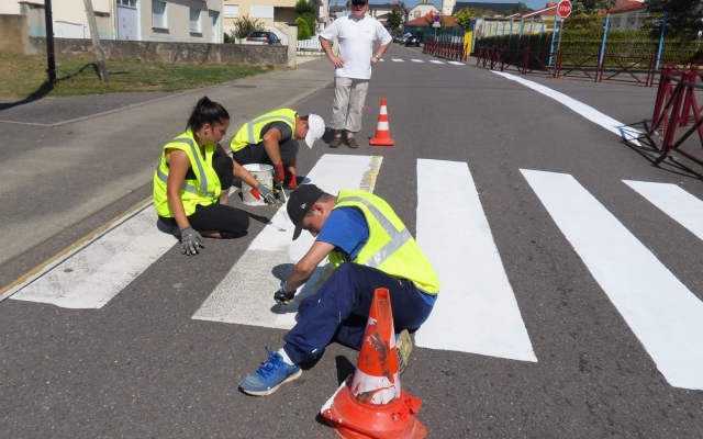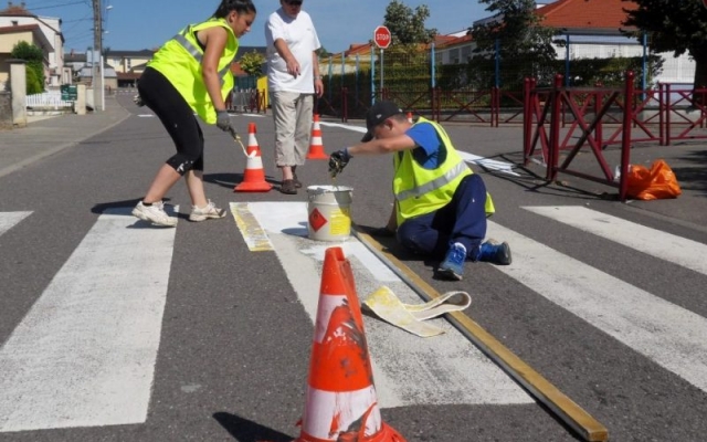 Elise, Sacha, Léanne, Thomas et Océane auxquels s’ajoutent quatre absents sur les photos (Matéo, Quentin Sofian et Elise), ont contribué à la vie communale en juillet-aôut : repeindre les passages piétonniers et les bornes d’incendie, désherber les allées du cimetière, peindre des planches destinées à la confection de tables et de bancs d’extérieur.